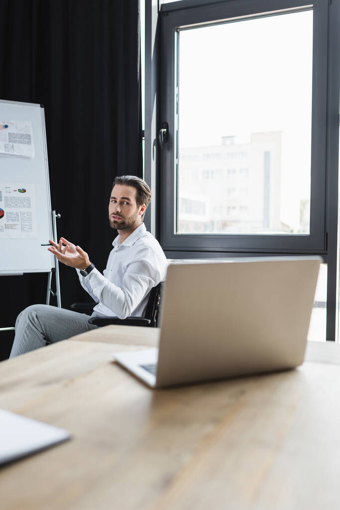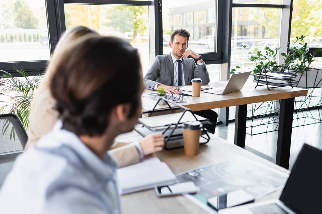 White-collar bank employees during a small conference or meeting with laptop at the luxurious office